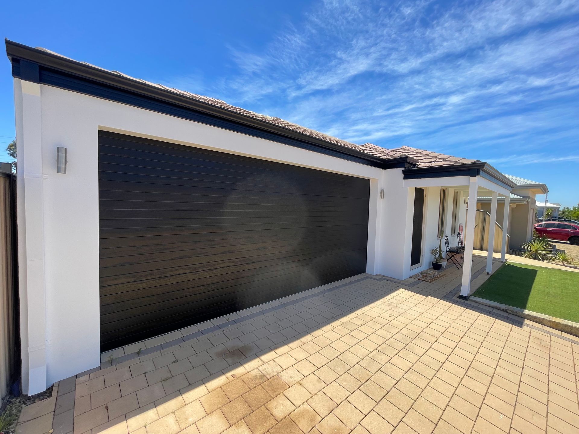 Exterior roller garage door, gutters and fascia sprayed black and walls and downposts painted white.